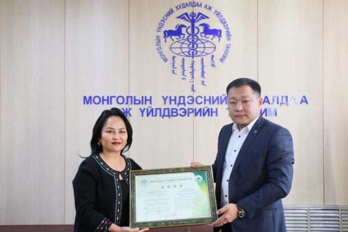 Soyolmaa JIGJIDSUREN,我们Out of NowHere酒店集团的副总经理,昨天收到了蒙古工商商会绿色酒店的全新标签,有效期3年。